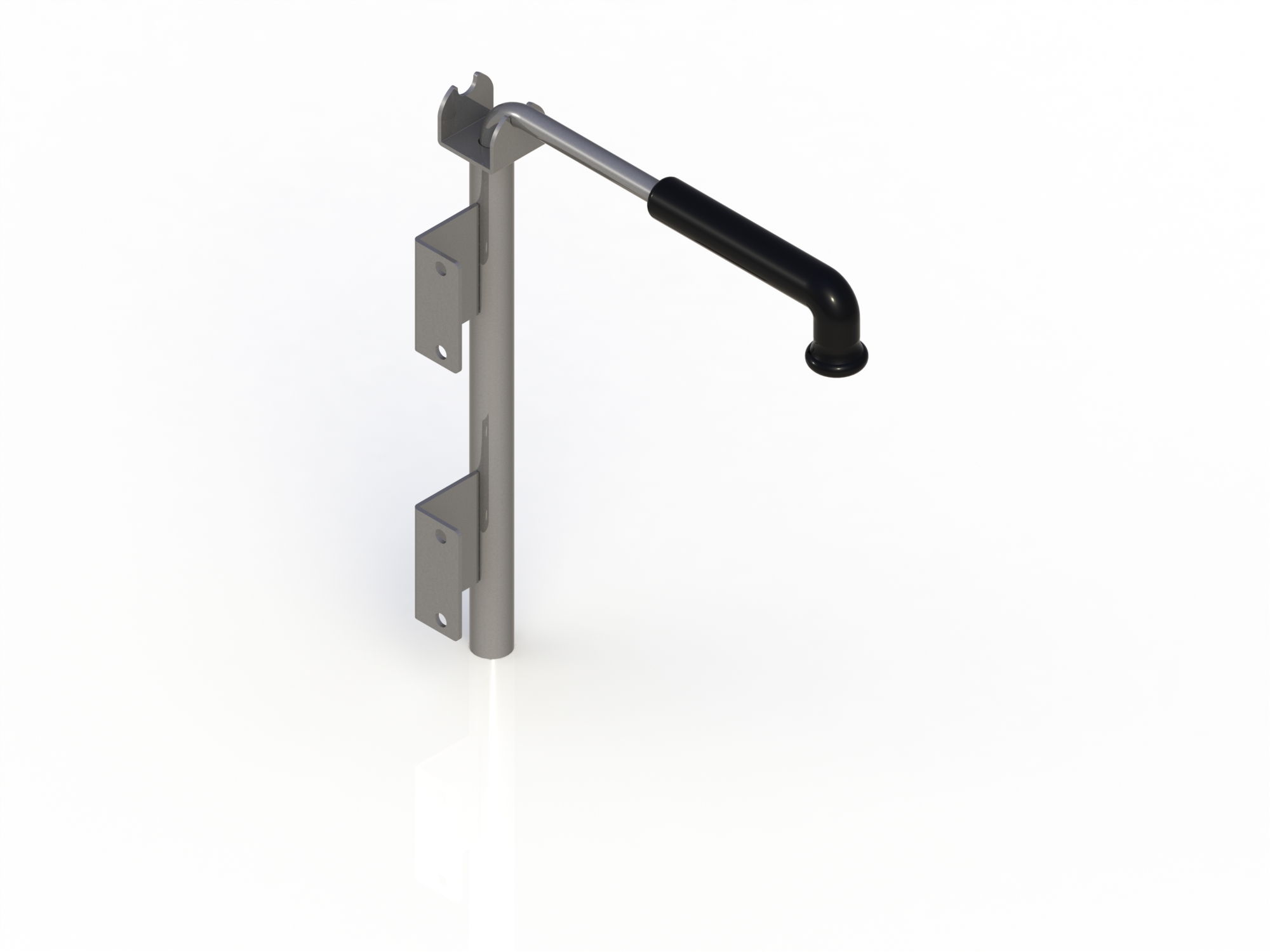 Solidny trzymacz drzwi, montowany pod skrzynią zabudowy ciężarowej, blokujący skrzydło drzwi do boku, przed niechcianym zamknięciem.